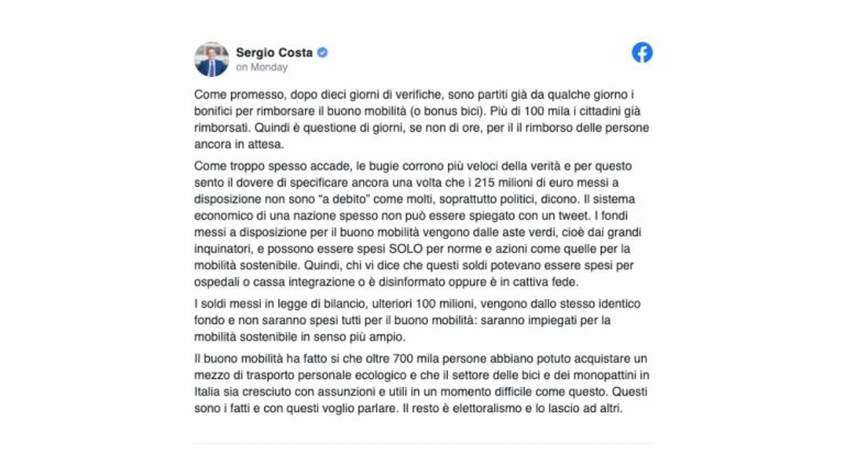 Nelle scorse ore il Ministro Sergio Costa si è espresso nuovamente sulla questione “rimborsi” relativa al Bonus Mobilità. Il Ministro ha comunicato infatti, che i bonifici stanno giungendo nelle casse degli italiani a ritmo spedito e afferma che ben 100.000 italiani sono già stati rimborsati a dovere. Ulteriori buone notizie inoltre, per tutti coloro che ancora devono ricevere l’accredito da parte del Governo. Costa ribadisce che mancano pochissimi giorni e, in alcuni casi, anche solo pochissime ore.