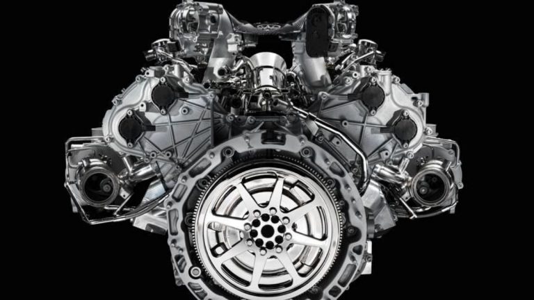 Il motore mostra un angolo di 90° che si crea fra le bancate che creano l’iconica “V”. La cilindrata da 3 litri viene alimentata da un sistema con doppio turbocompressore, convinta ad un sistema di lubrificazione a carter secco. Cosa si ottiene? 7500 giri al minuto con 730 nm di coppia e potenza erogata massima di 630 CV.