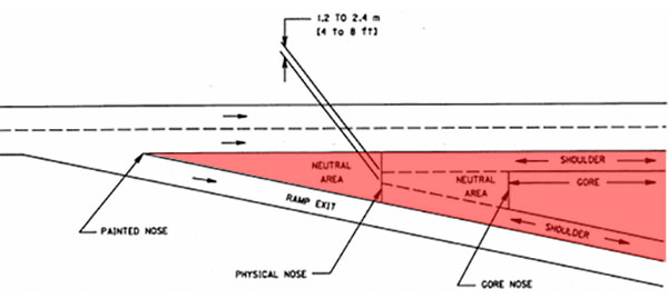 Più precisamente le anomalie segnalate a Tesla prima della fatalità avevano provocato un comportamento imprevisto della Model X, deviandola all’improvviso verso quella che viene definita “gore area” ovvero la porzione di carreggiata che separa la corsia dell’autostrada che prosegue dritta da quella che invece porta al casello di uscita. Per capire meglio di cosa si sta parlando l’abbiamo evidenziata in rosso nell’immagine seguente, prelevata da un documento del Dipartimento dei Trasporti statunitense. Il conducente vi aveva posto rimedio correggendo con prontezza la traiettoria.